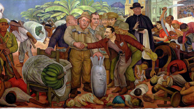 «Gloriosa victoria», obra del muralista mexicano Diego Rivera. En el centro del cuadro, el secretario de estado de los EE.UU, John Foster Dulles le da la mano a Castillo Armas. El jefe de la CIA, Allen Dulles, y el embajador estadounidense en Guatemala, John Peurifoy están regalando dinero a los comandantes militares, mientras que los indígenas trabajan como esclavos, cargando los barcos de la United Fruit Company con bananos. A los pies del embajador, hay un bomba antropomorfizada que contiene la cara sonriente del presidente Dwight Eisenhower. En el fondo está el arzobispo Mariano Rossell y Arellano oficiando una misa sobre los cuerpos masacrados de los trabajadores. Este cuadro fue prohibido en los Estados Unidos y desapareció completamente durante los siguientes cincuenta años. En el año 2000, fue encontrado en una bodega del museo Pushkin, en Rusia y desde entonces, está en calidad de préstamo y en exhibición permanente en México. Este mural aunque retrata un episodio de la historía Guatemalteca, en realidad muestra la politica Norteamericana en América Latina, que grande Diego Rivera!.